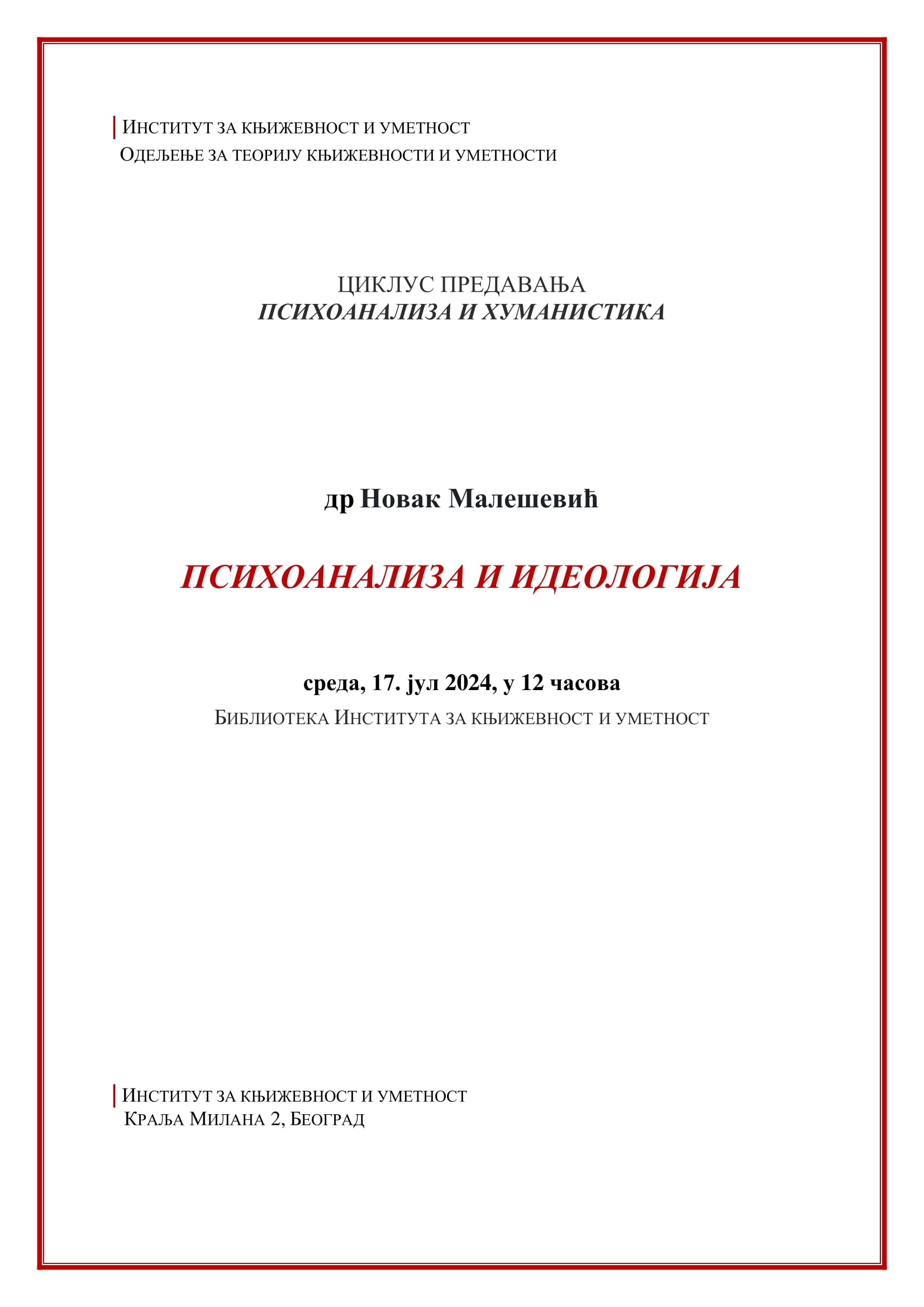 У организацији Одељења за теорију књижевности и уметности, 17. јула 2024. у 12.00 часова у Библиотеци Института др Новак Малешевић одржаће предавање „Психоанализа и идеологија“.